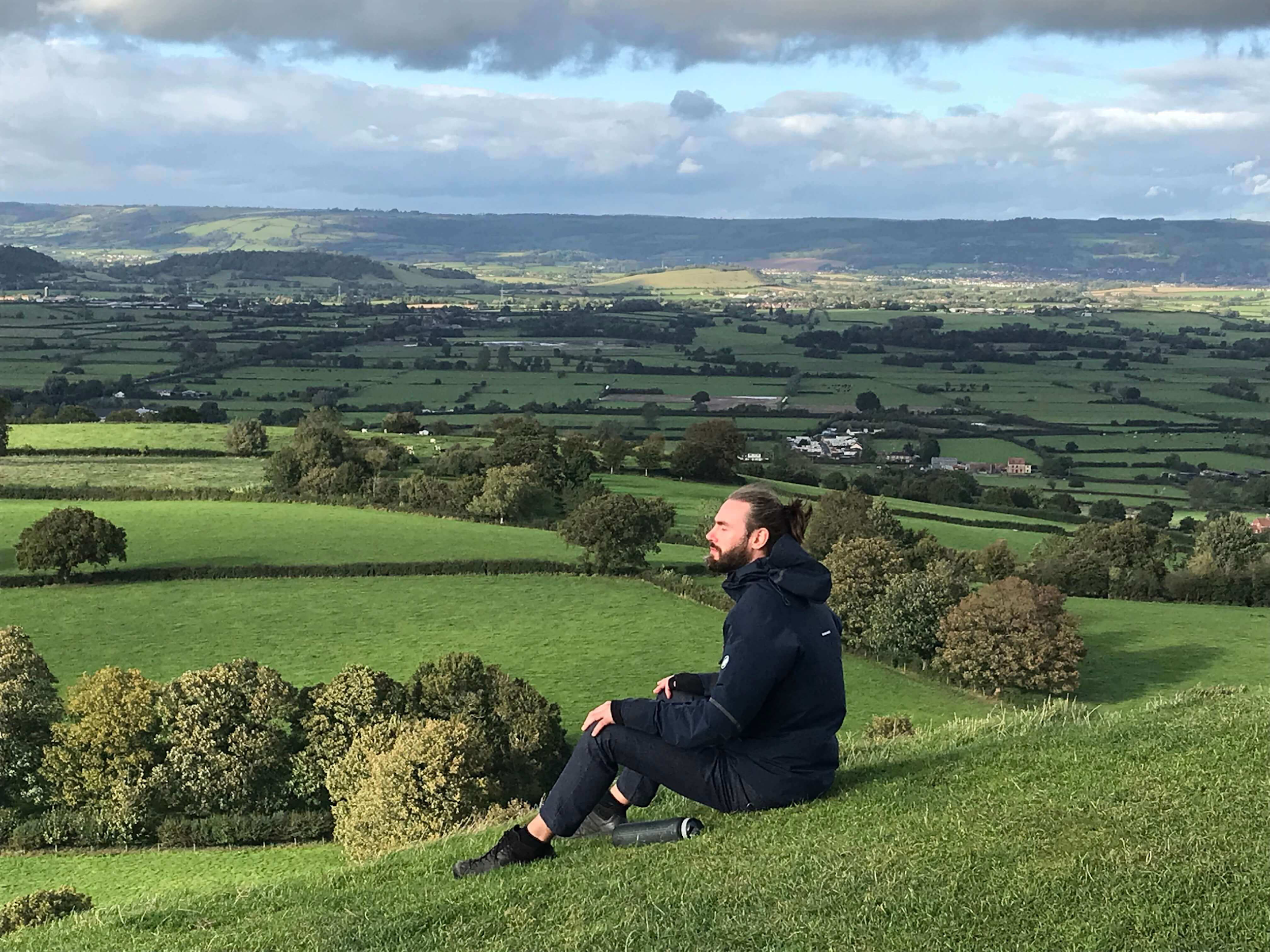 This photo shows my friend and colleague Dom, breathing and meditating at the top of Glastonbury Tor (in a howling gale!)